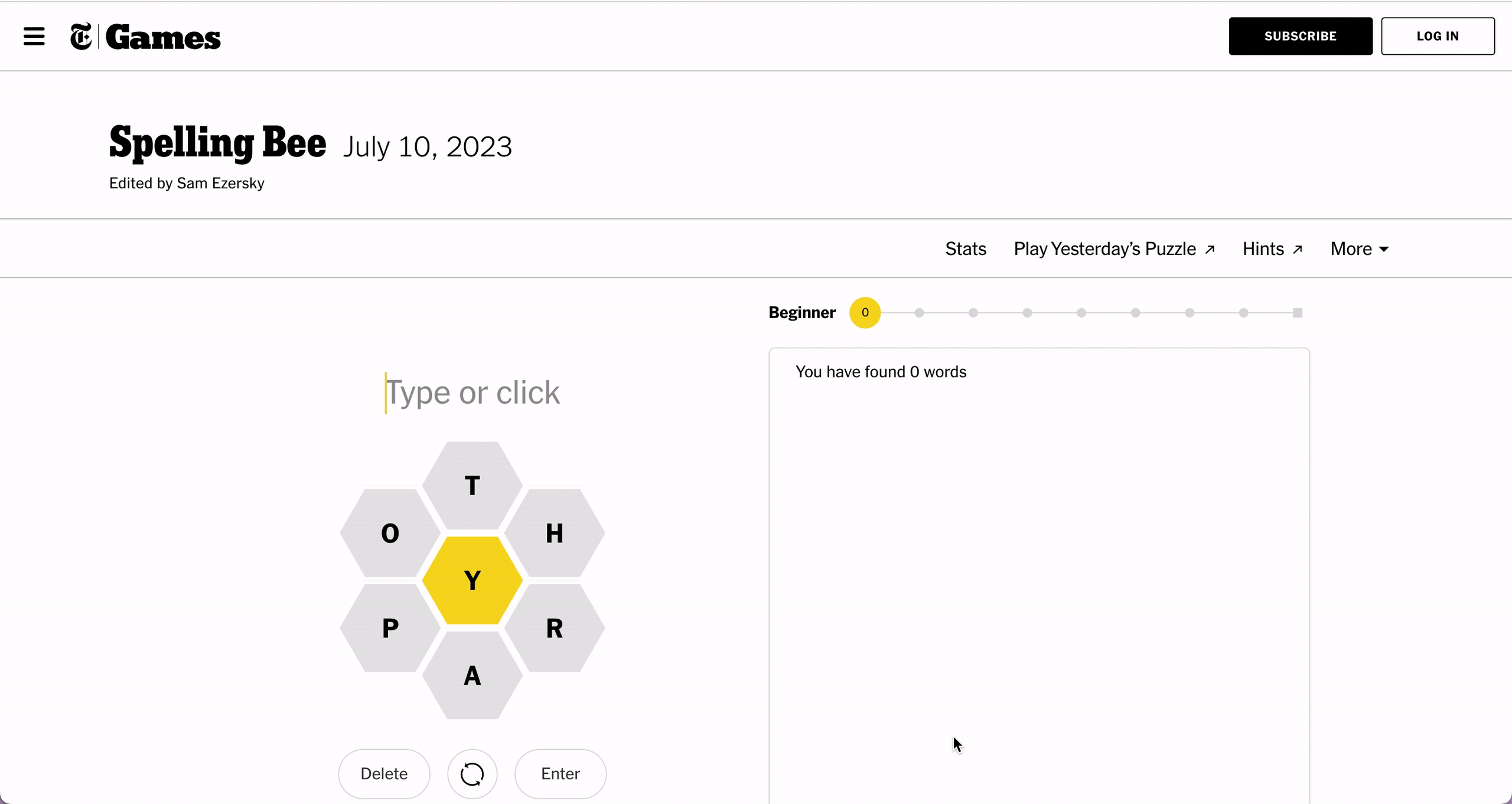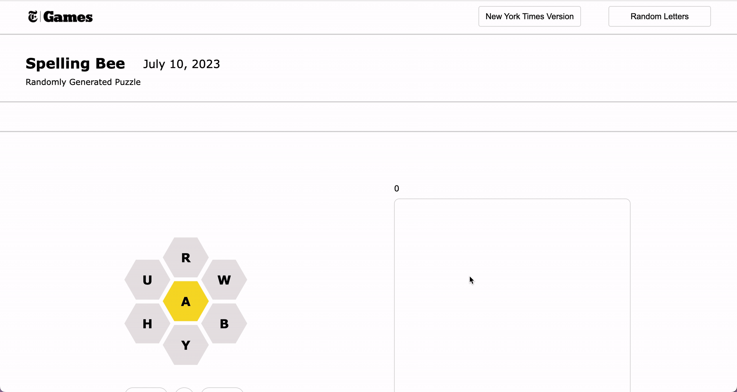 During my senior year of high school, I became obsessed with the New York Time's Spelling Bee, a game that challenges players to make as many words as they can with a daily bank of seven letters. As a thrifty high school student, I didn't want to spend excess $$ on a NYT subscription, which is required to access the game. This motivated me to take on this project, a webscraped version of the game that scrapes the daily letters directly from the NYT website. Try it here!!